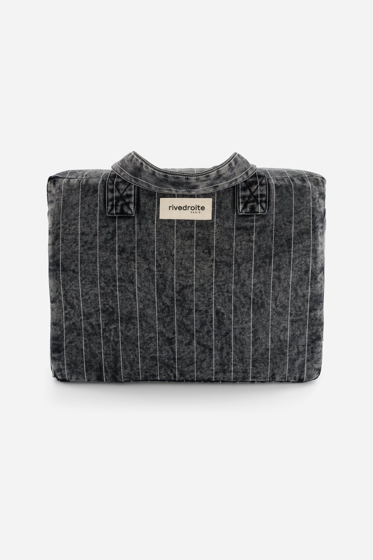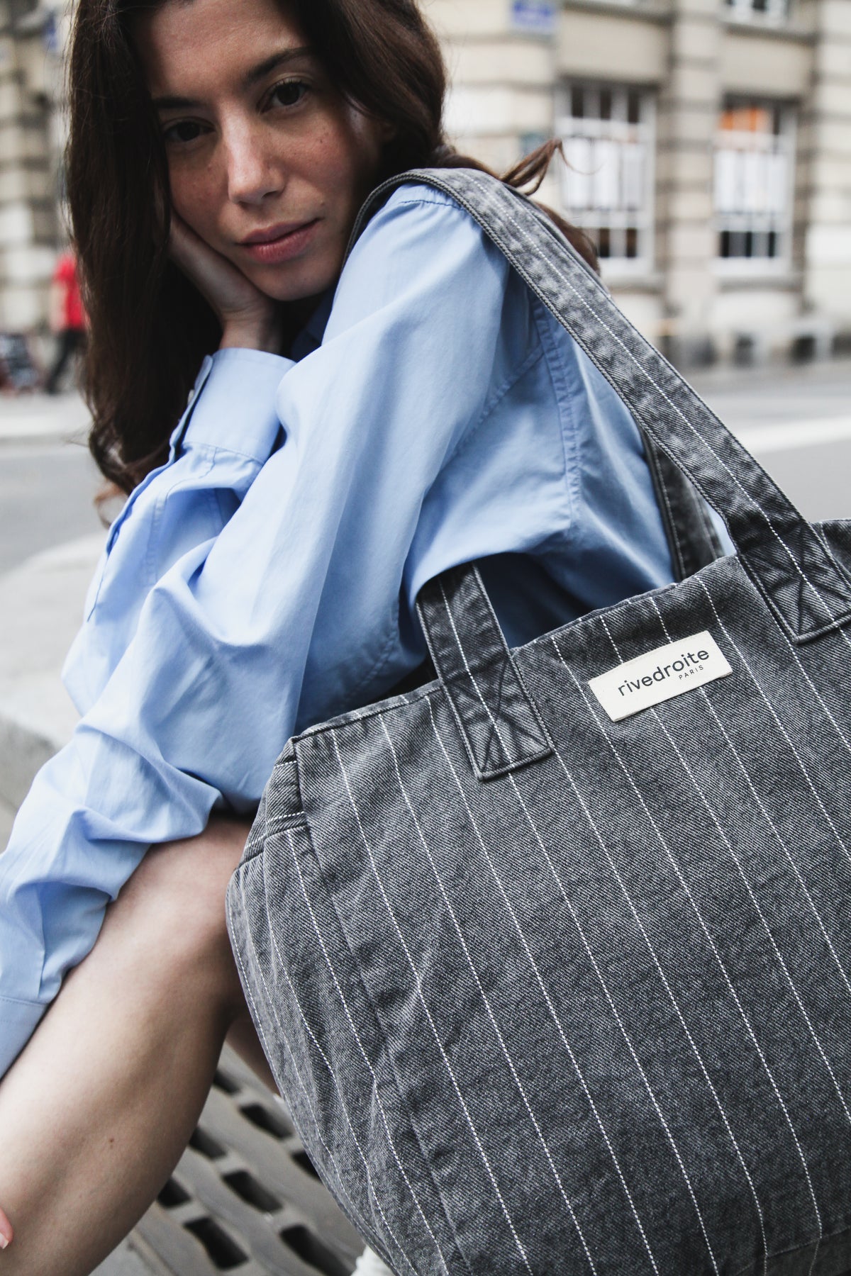 Célestins le sac 24 heures se décline en version rayée, dans une toile de denim bleu délicatement patinée. Il est cousu puis délavé à la pièce, ce qui lui confère un look vintage inspiré des 90’s.