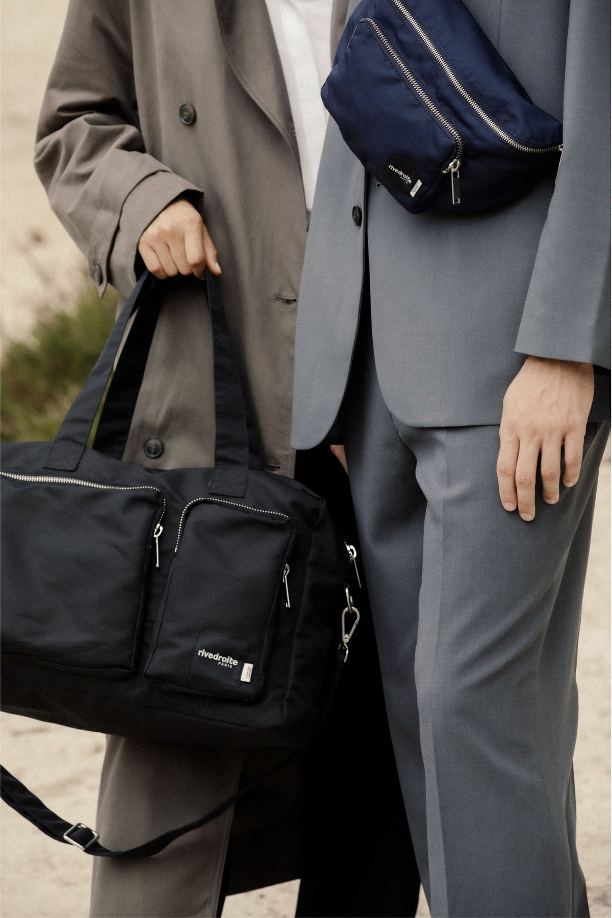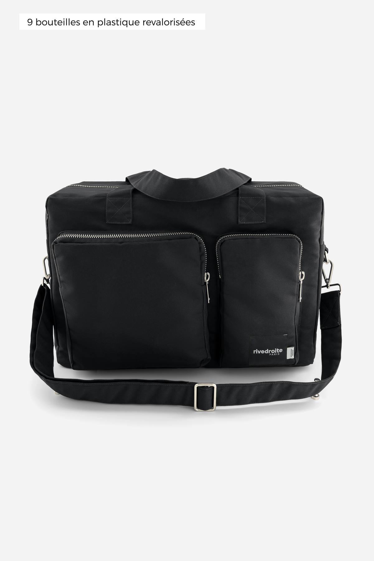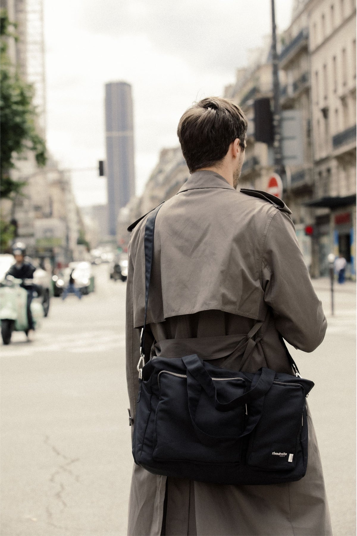 À l’extérieur, deux grandes poches zippées permettent de garder l’essentiel à portée de main : téléphone, portefeuille, livre... À l’intérieur, une poche compartimentée accueille facilement un ordinateur 16 pouces. Un grand espace central permet de ranger 2 tenues complètes, une paire de chaussures et une trousse de toilette. Sa grande bandoulière croisée en fait un vrai city bag, confortable à porter à l’épaule ou en crossbody.