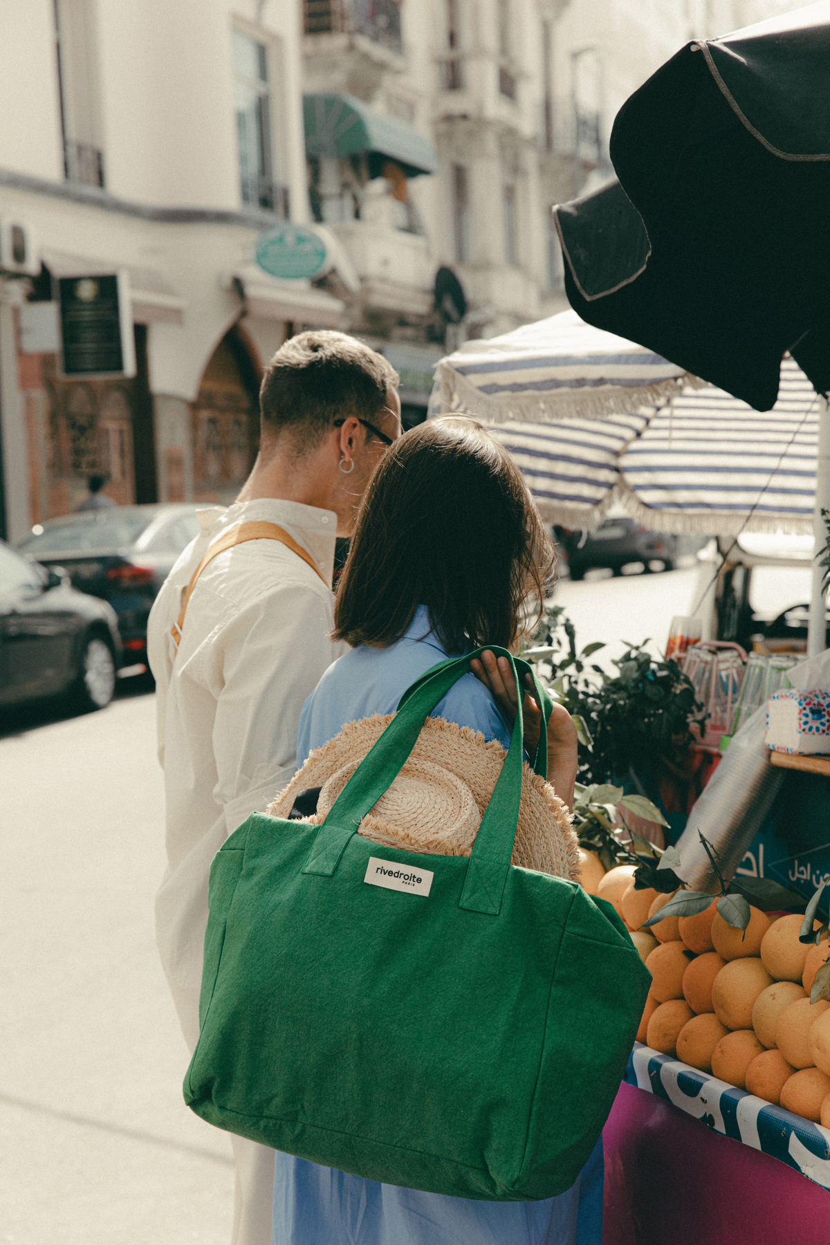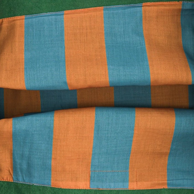 Ses doublures intérieures sont issues, comme toujours, de fins de stocks de tissus de l'industrie textile unies à qui on donne une seconde vie, sur lesquelles on a imprimé des rayures Bleu Méditerranée et Orange Turmeric pour encore plus de good vibes.