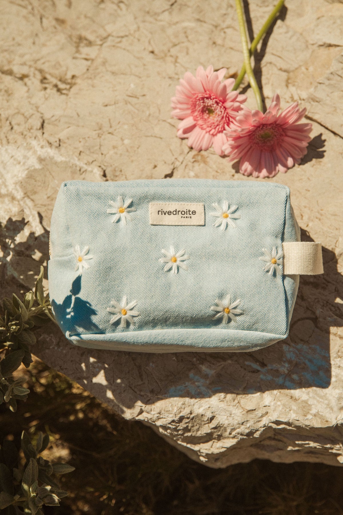 Brodée de fines marguerites délicatement parsemées sur la toile de denim upcyclé, délavée pour l'occasion dans une teinte ultra claire, Tournelles la trousse beauté version XL va devenir l'essentiel de vos bagages d'été. Dans votre valise ou votre sac de plage, vous allez adorer sortir votre trousse beauté brodée. Vous y glisserez très facilement tous vos essentiels de voyage : make-up léger, soins corps et visage et les indispensables crèmes solaires.